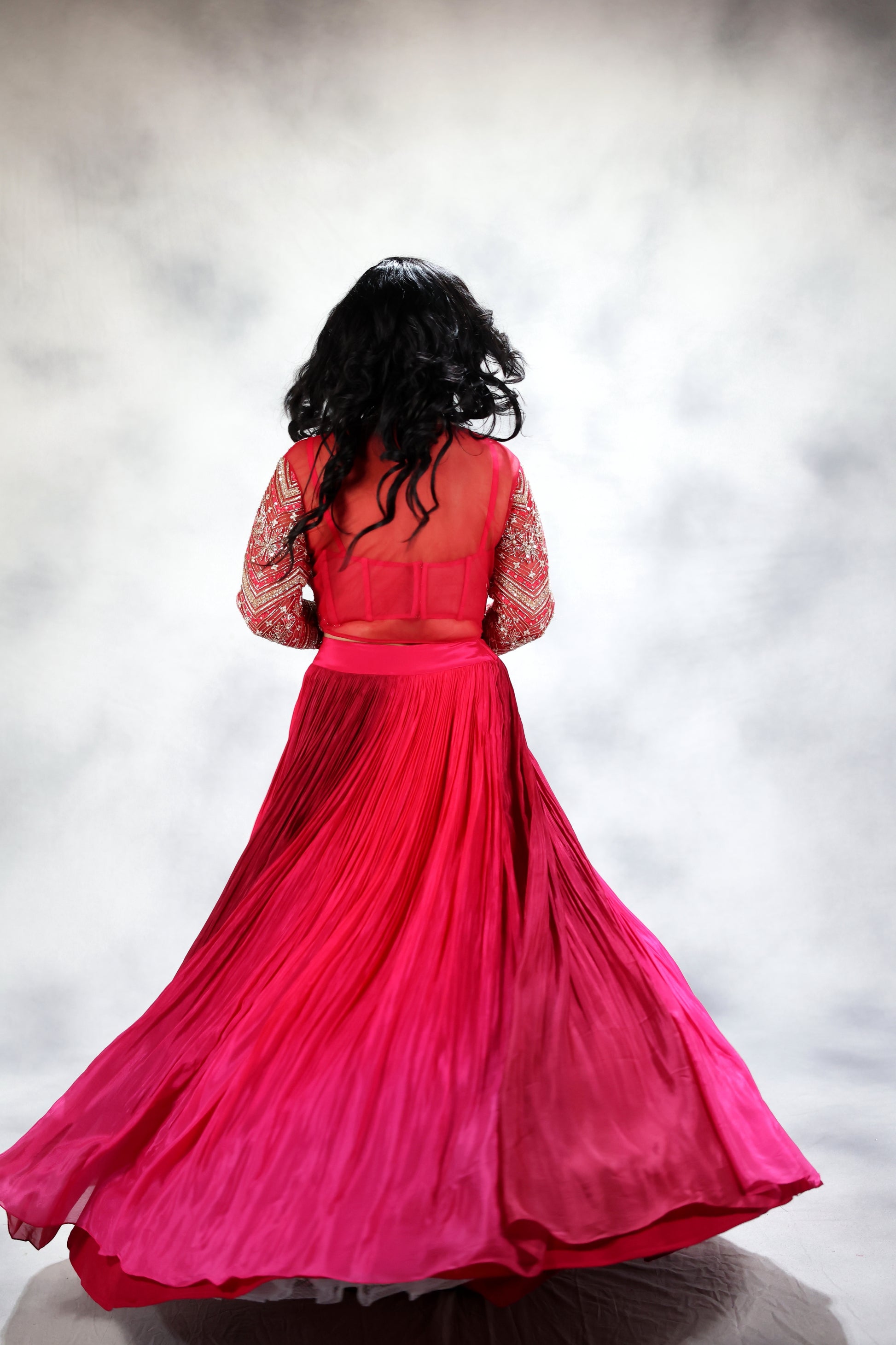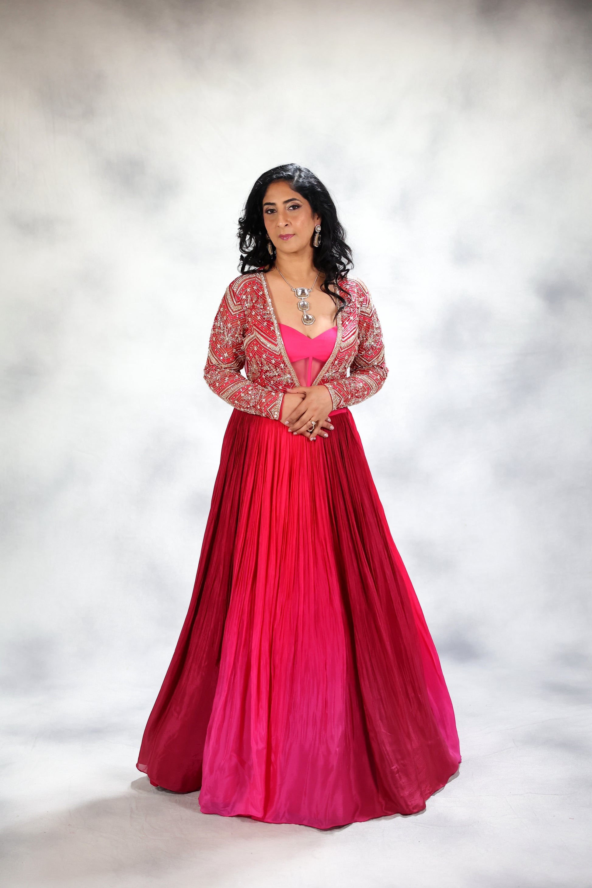Hand embroidered jacket paired with corset and ombre dyed skirt.