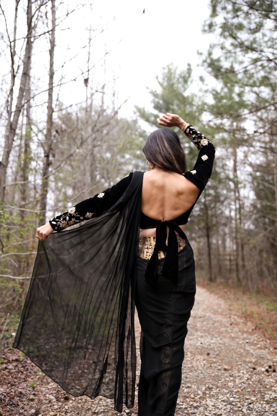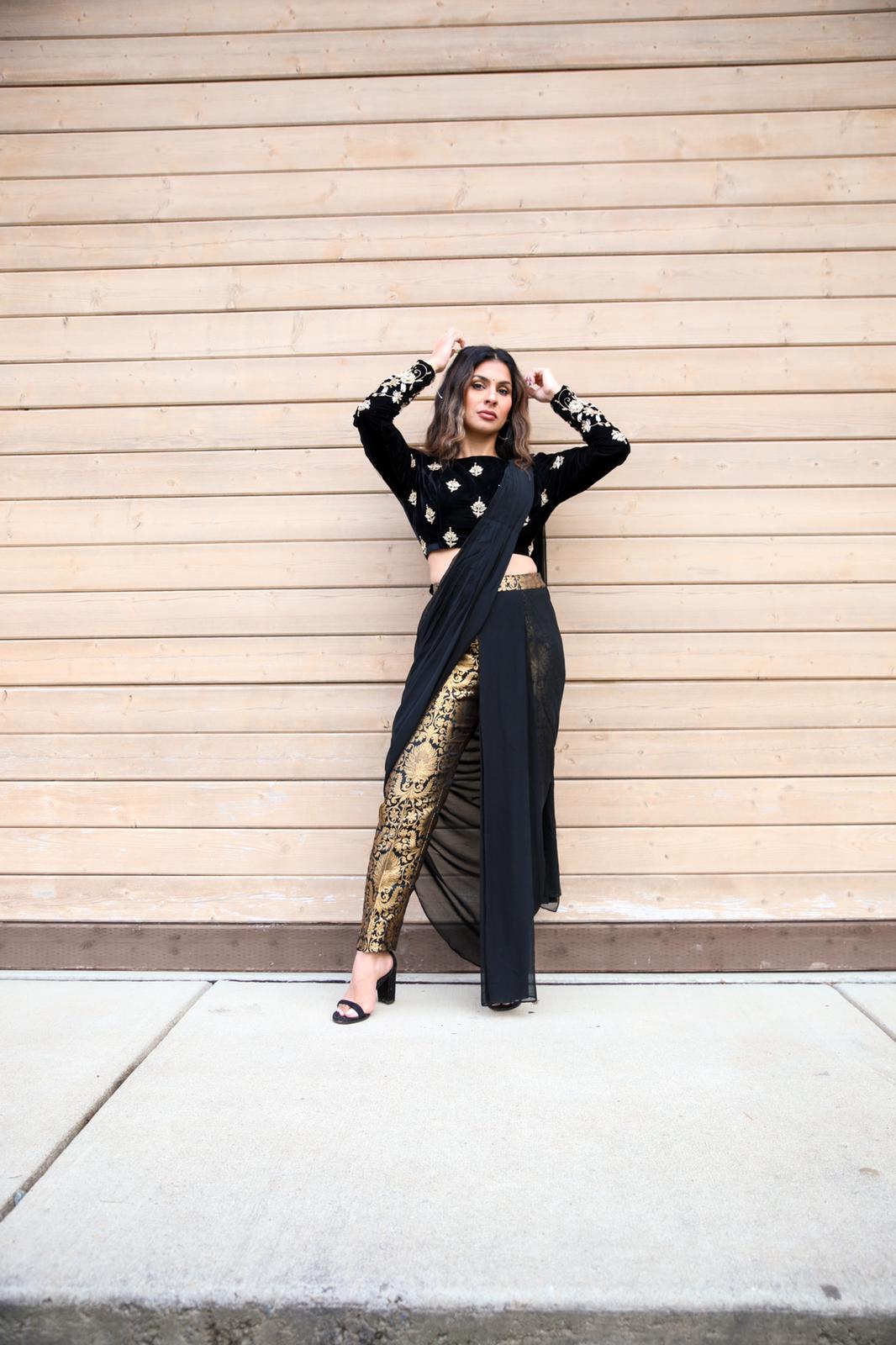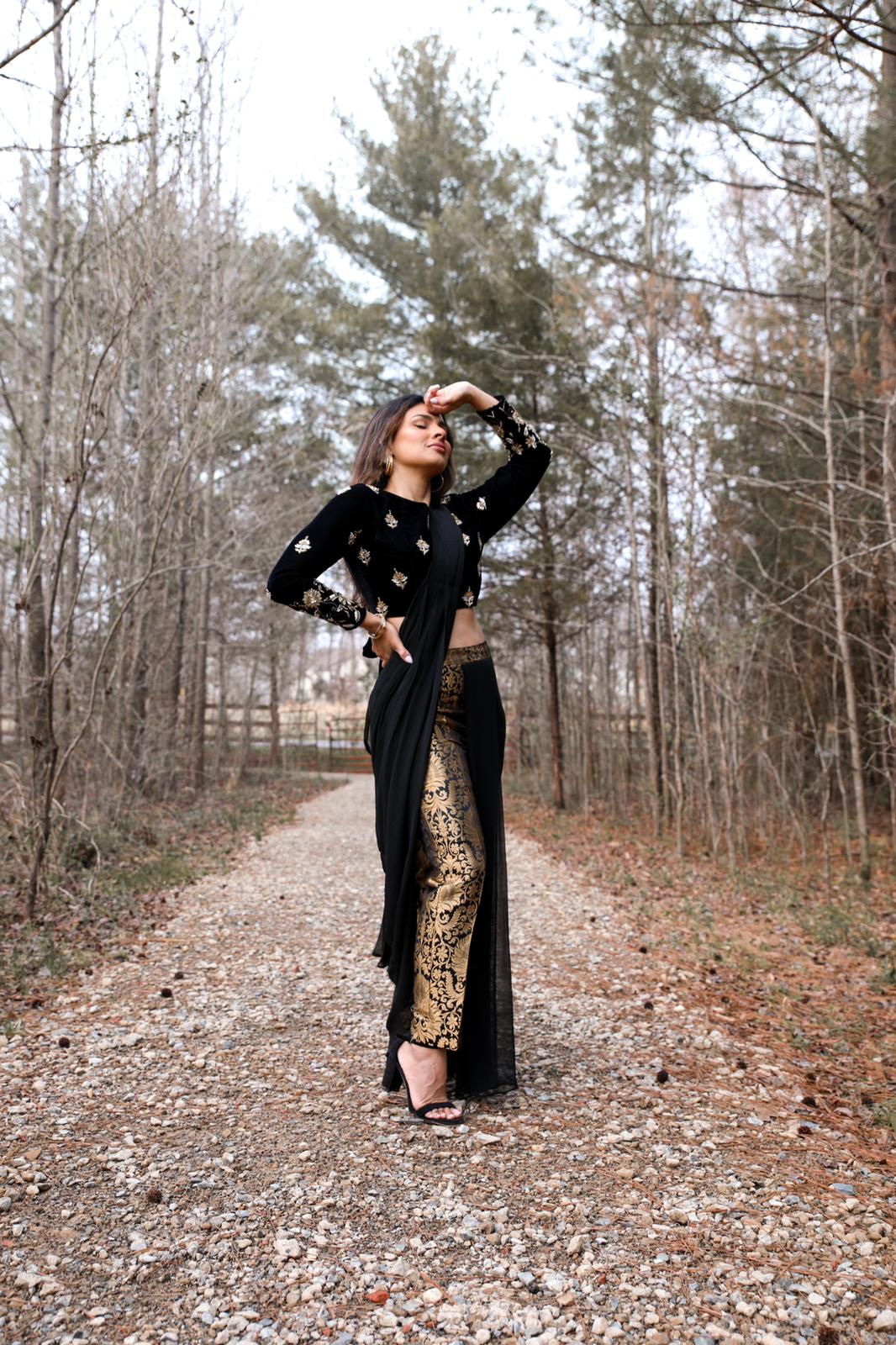 Predraped brocade pant saree paired with hand embroidered blouse .